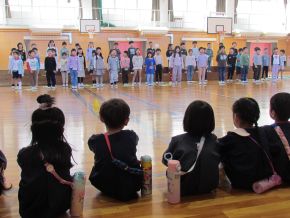(左)園の年長さんが1年生の学芸会の練習を見に来ました。その後、運動場で楽しく遊んでいってくれました。少しは小学校の雰囲気を味わってもらえたでしょうか?