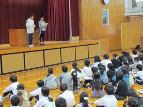 (左)おはよう集会の様子です。6年生から12月の月目標は「からだをきたえよう」という発表がありました。まずは健康に留意し、みんなが元気に学校に来られることを願っています。