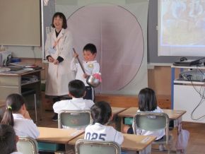 (右)1年生は栄養教諭をお招きして、給食ができるまでのひみつを学びました。実際に使っている器具の大きさにびっくりしました。 |