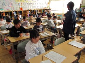 (右)2年生書写です。硬筆でしたが、みんな手本をしっかり見て、集中して書くことができていました。 |