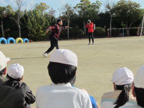 その後、運動場に出て、湯上選手の円盤投げを見せていただきました。力をセーブしたとはいえ、すごく遠くまで円盤が飛んでいく様子を見て、子供たちから「おおーっ!」という声があがりました。そして何と、湯上選手じきじきにコツを教えていただき、子供たちに円盤投げの体験までさせていただけました。