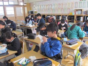 (左)6年生家庭科です。さし子つきトートバッグを作っています。細かい作業でみんな集中して取り組んでいました。