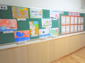 (右)各学年の掲示板には、三吉っ子の作品が掲示されています。見ごたえのある作品ばかりです。 |