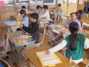 (左)2年生図工です。窓をあけると絵が出てくるしくみの作品を作ります。みなさんのアイデアを期待しています。