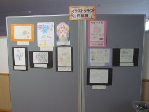 (右)今日は正課クラブの最終日でした。イラストクラブの作品が1階渡り廊下に展示されています。みんな見に来てね! |