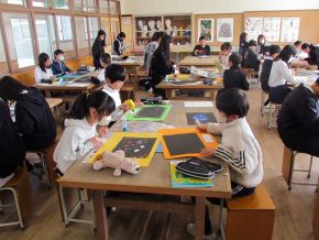 (右)5年生図工です。多色版画に取り組んでいて、今日は作品を台紙に貼っていました。力作ぞろいです。 |