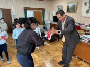 (左)新聞社主催の新聞コンクールにSDGsについてまとめた新聞を応募したところ、中部支社賞に選ばれ、表彰伝達しました。校長室に遊びに来ていた三吉っ子とみんなでお祝いしました。