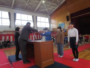 (左)明日の卒業式に向けて最後の練習を行いました。その中で、6か年休まなかった精勤賞及び教育委員会褒賞の表彰を行いました。