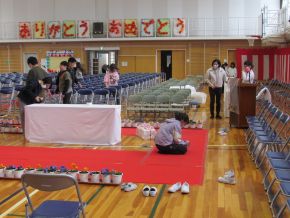 今年度は6年生の晴れの舞台に1~5年生の全校児童が体育館に入り、お祝いの気持ちを伝えました。また、6年生の位置を、ひな壇からフロアに移し、全体の距離を縮めてアットホーム的な卒業式にしたいと考えました。