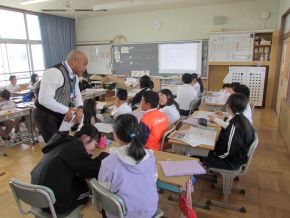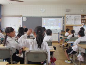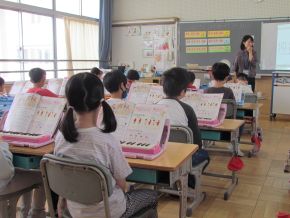 (左)2年生音楽です。鍵盤ハーモニカを使って演奏しました。みんな指づかいを意識してがんばっていました。(右)6年生外国語科です。英語を使って「好きなものは何ですか?」のやり取りを友達を行いました。 |