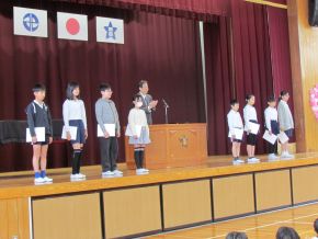(左)朝、おはよう集会を行い、児童会役員、委員会委員長副委員長、学級委員の任命を行いました。みんな大きな声で「はい」と返事をし、やる気がみなぎっていました。期待しています。