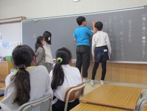 (右)三吉小では学びを深めていくための方法の一つとして、ペアやグループでの仲間との学び合いを大切にしています。今日も、いろいろな学級の授業で、友達との学び合いの場面が見られました。 |