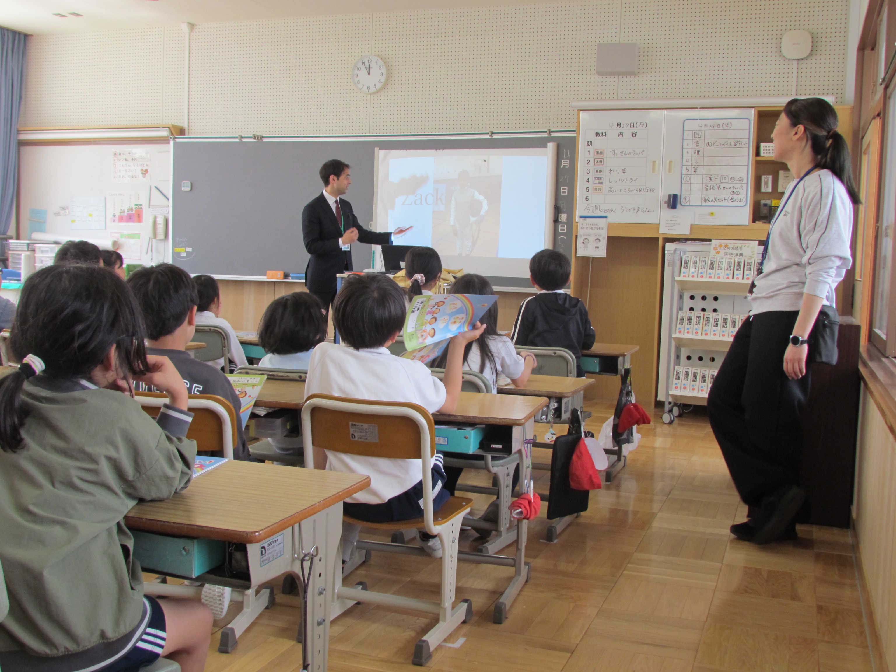 (左)3年生外国語活動の様子です。3年生からは週に1時間あります。ALTの先生と一緒に英語に慣れ親しみました。