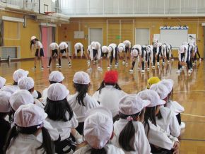 (右)運動会の練習が始まっています。体育館に行ってみると、6年生が1年生にラジオ体操の手本を示していました。 |