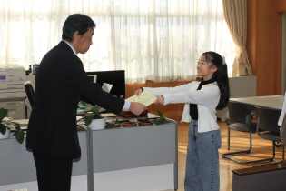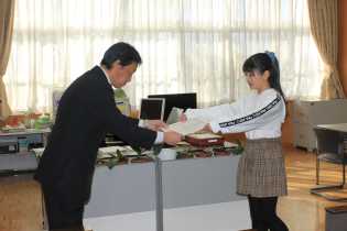 業間に豊田税務署の方が来校され、6年生2名の表彰をしていただきました。