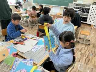 図画工作科では、「どんなうごきにみえるかな」をテーマに、紙を折ったり、切ったりすることで、思い思いのものをつくっていました。同じ材料を使っているのに、蛇や恐竜のような強い生き物からひらひらと華麗に舞うチョウなど、世界に一つだけの作品ができ上がっていくのが不思議です。