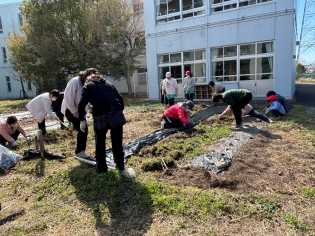 グリーンボランティアの児童と毎週水曜日の健康体操に参加されている地域の方(10名)と一緒に小学校中庭交流農園のマルチ張りをしました。