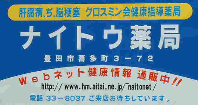| お気軽にご来店下さい ◆地下鉄豊田新線 豊田市駅東口 (豊田スタジアム側) 徒歩8分以内 ![]() ![]() google地図検索 ナイトウ薬局/電話/FAX:0565-33-8037/豊田市喜多町3-72/豊田市駅東口徒歩8分以内/駐車場完備 NAITOU pharmacy /tel:0565-33-8037/3-72, Kitamachi, Toyota-shi Toyota station east gate on foot 8 minutes/Parking lot full equipment I refuse use of the credit card payment is credit card only cash. 病気予防こそ最大の防御なり/Sick prevention is just the greatest defense/ 防御用品は健康通販naitonetで/A defense article is the healthy mail order naitonet I refuse use of the credit card payment is credit card only cash. |