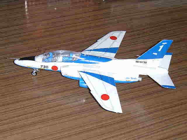 ついにつくったブルーインパルス。T-4のブルーインパルスがなくておもちゃ屋さんに頼んで取り寄せてもらい、一週間かけて、楽しみながらつくりました。カラーが足りなくて、近い色で仕上げたのでリアリティはないけど、大好きなブルーインパルスができて大満足です。 |