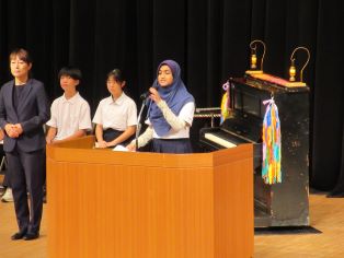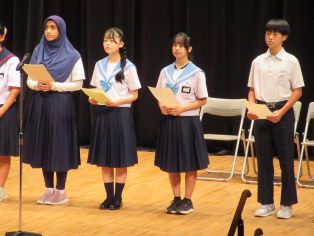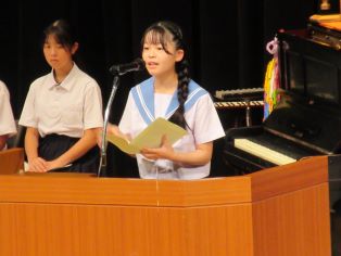 カネヨシプレイスにて「平和を紡ぐつどい」が行われ、本校からも4名の生徒が参加しました。2名の3年生が市の代表として、堂々と広島派遣の報告を行いました。 |