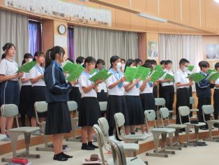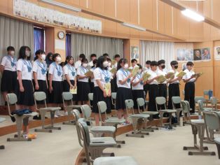 合唱コンクールに向けて、各学級の練習にも熱が入っています。講師の先生からも専門的な指導をいただき、自信をもって歌うことができるようになってきました。3年生の学級では、愛知教育大学から学校体験活動として、7日間の実習をスタートさせました。合唱練習等でともに学んでほしいと思います。 |