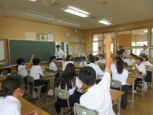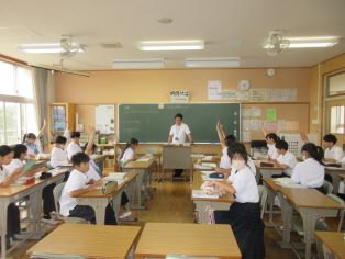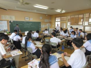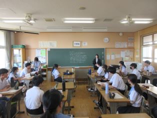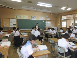 3年生の学級では、社会科の授業で、実際の裁判から権利について学びました。どの生徒も自分の考えをもち、真剣に話し合う姿が見られました。2年生の学級では、愛知教育大学から学校体験活動として、7日間の実習をスタートさせました。2年生の生徒とも良好な関係を築き、ともに学んでほしいと思います。 |