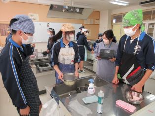 | 3年生と1年生の調理実習の様子です。3年生では、幼稚園実習を終えて、幼児が栄養を十分にとるためには、おやつを摂取する必要性を学んだことを生かして、「マカロニきなこ」を作ることに挑戦しました。栄養価も計算しながら、真剣に園児のことを考えている姿がとても印象的です。 |