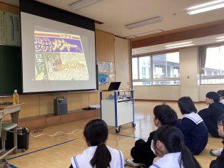 | 5,6限目に1年生を対象に、講師の方をお招きしハピエコ講座を行いました。フードロスなどの環境問題について考えるだけでなく、たった一つの正解を追い求めるだけでなく、自分にとっての正解を探して表現できるようになってほしいという話もしていただきました。今後の学校生活に生かしてほしいと思います。 |