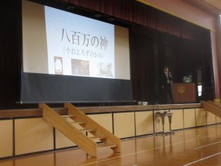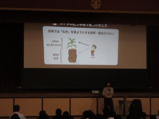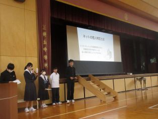 | 3時間目に冬休み前最後の集会を行いました。情報委員会からは「デジタル・シティズンシップ教育」について、人権委員会からは「LGBTQ」などの人権にかかわる内容について、クイズ形式にして、全校生徒に分かりやすく伝えました。校長先生からは、年末年始らしい「八百万の神」についての話がありました。日本らしい有意義な冬休みとなるよう、過ごしてもらえたらと思います。 |
