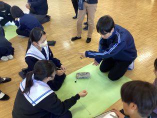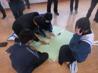 | 5限目に2年1組で数学科の研究授業を行いました。「サッカーコートをかくために、いつでも直角な線をかくにはどうしたらよいかな」という目標を達成するために、グループの仲間と協力しながら学習を進めました。与えられたロープを使って、これまで習った二等辺三角形の性質を思い出しながら、なぜ直角になるのかについて追究する姿が見られました。 |