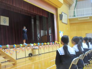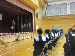 | インフルエンザによる感染症拡大防止のため、延期となっていた三年生を送る会ですが、本日の5,6時間目に無事開催することができました。3年生を楽しませようと、1.2年生で構成する様々な実行委員会がすてきな会場を、出し物を披露しました。3年生の喜んだ表情が印象的で、メリハリのついたとても心温まる時間となりました。 |