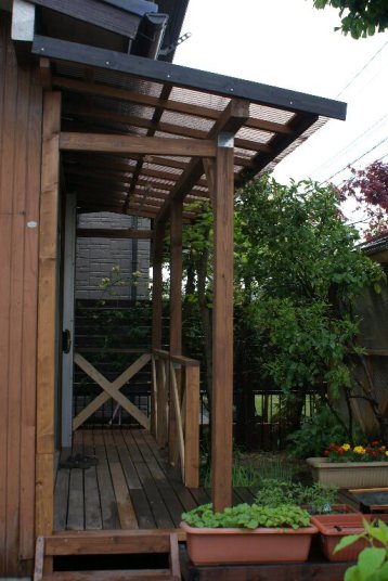 ウッドデッキにタープを張りました。広さは約6畳(母屋より広い!)。使わないときは軒に収納します。 | |||||