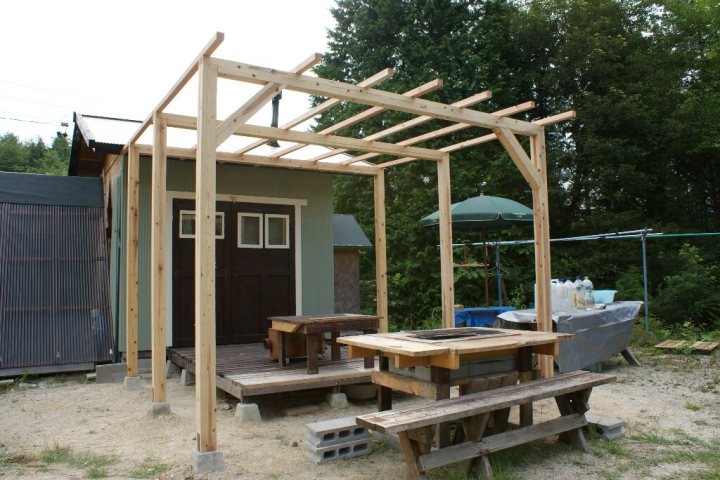 二つ目と三つ目の柱と梁を組み立て、垂木をつけました。後は胴ブチを横に渡して屋根材を貼ります。 | |||||