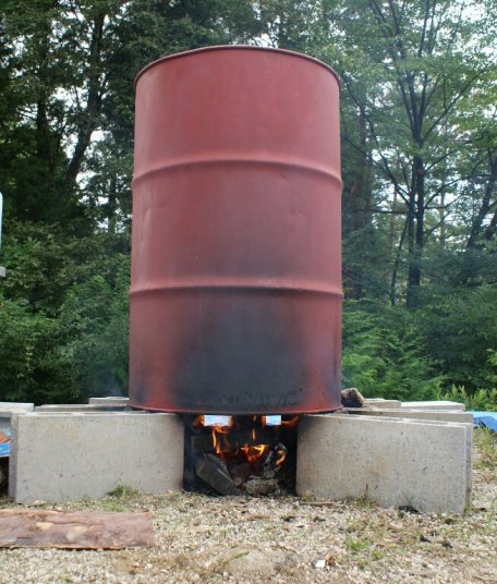 とりあえず屋根に雨よけシートを被せました。 ドラム缶風呂の作成に着手。フタを切り取り、中の油を燃やしました。 |