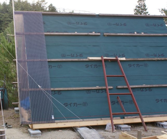 片側の波板を張り終え、入り口ドアを仮付けしました。 | ||||||