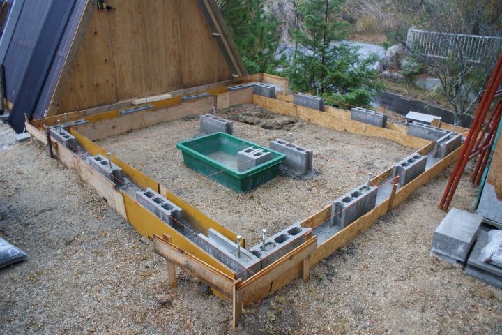 三角小屋と仮設トイレの間に「現場宿舎4.5畳」を作ることにし、 基礎工事を始めました。 |