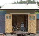入り口のドアを付け、壁を張りました。 「この屋根をどうやって上げるの?」と4.・5人に聞かれました。 上げません。物置兼バンガローとしてこのまま使います。 |