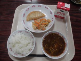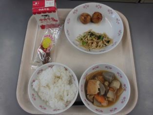 <十五夜行事食> ・ご飯、牛乳、月見団子 ・芋たき、ごぼう入りつくね ・切り干し大根と小松菜のごまあえ 今夜は十五夜です。月見は、中国から伝わった風習で、里芋などの収穫されたばかりの農作物を供えて豊作に感謝する習慣があります。 |