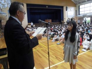 教頭先生の話 前期のがんばりについて話がありました 表彰 ・社会を明るくする運動 毛筆 ・読書感想文コンクール ・みよし市詩・作文コンクール 最後に校歌を全員で歌いました |
