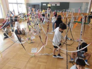 1年生 算数 たしざんめいじんになろう 7+4の計算のし方を考えよう 2年生 図工 つないでつるして つながってできた形の面白さを見つけて、もっとつないでいこう |
