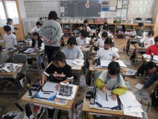 | 4年生 図工 ほってみつけて 版画に色をつけよう 算数 1目もりが1万tのぼうグラフをかこう |