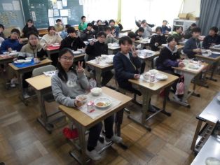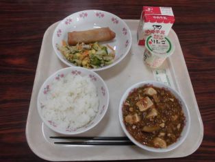 | 今日の献立 ・ご飯、牛乳 ・マーボー豆腐 ・春巻き、ウルトラ元気サラダ ・リンゴヨーグルト 今日の給食は三好中学校のリクエスト献立です。 |