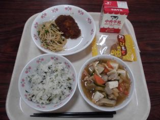| 今日の献立 ・わかめご飯、牛乳、わらび餅 ・具だくさん汁、ソースカツ ・切り干し大根と小松菜のツナあえ 今日の給食は、中部小学校のリクエスト献立です。世界文化遺産である「和食」を中心としたメニューで、給食で人気のわかめご飯とソースカツにみよし市の給食で初めてのわらび餅がついています。 |