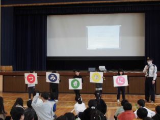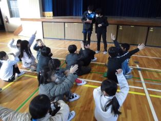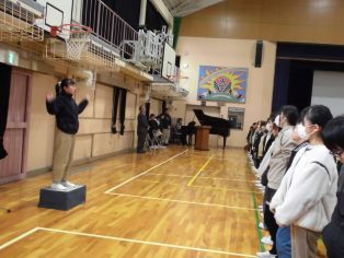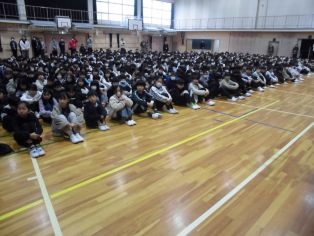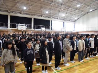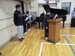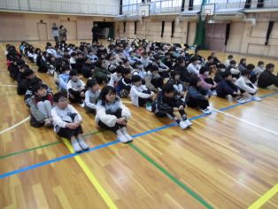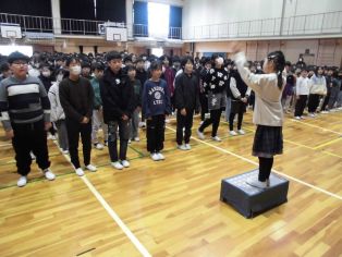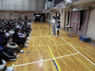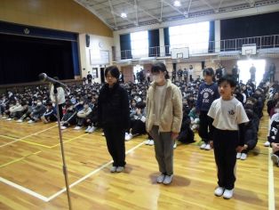 | 1月7日(水) 冬休み明け集会を体育館で行いました。 運営委員会が司会を務めました。 |