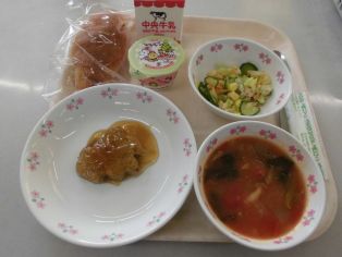 | 今日の献立 ・米粉パン、牛乳、ミネストローネ ・もみの木ハンバーグの玉ねぎソースかけ ・野菜とささみのサラダ ・クリスマスデザート 冬休み前最後の給食は、クリスマスデザートがつきました。 |