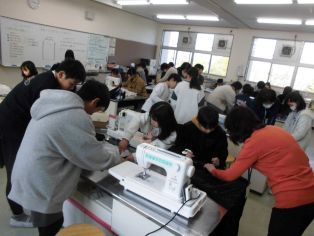 | 2月19日(木) 5年生 家庭科 エプロン作り すそとひもを通す所をぬおう 今日もたくさんのボランティアの方にお手伝いいただきました。 |