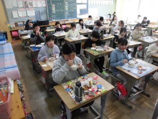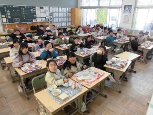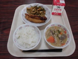 | 今日の給食献立 ・ご飯、牛乳、いも煮 ・子持ちししゃもフライ ・打ち豆と糸切りこんぶの煮物 今月の日本全国食めぐりは山形県です。「いも煮」は里芋を中心に肉や野菜、きのこなどを一緒に煮込んだ東北地方を中心に親しまれる郷土料理です。 |