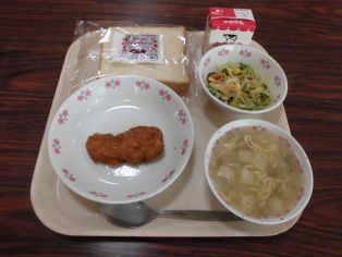 | 今日の献立 ・スライスパン、牛乳、いちごジャム ・ABCスープ、ウルトラ元気サラダ ・三河赤鶏のチキンカツ 今日の給食は三吉小学校のリクエスト献立です。給食委員会で話し合い、全校にアンケートをとりました。 |