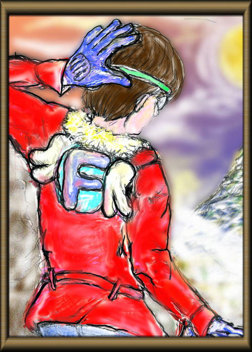 | この絵はBBSにもよく遊びに来てくれるネットでできた友人 ふぁんずーさんをイメージしたCGです、 背中のふぁんずーさんのFマークだけ先に考えたので、 スキーウエアーにしてスキー場のイメージになってしまった物です あくまでもイメージで後姿ですので、 実物のふぁんずーさんとはちょこっと違うかもしれません |
