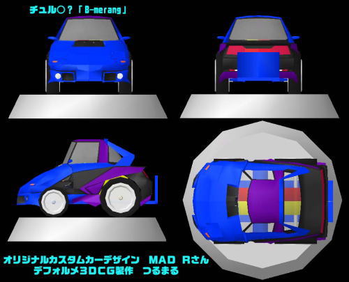 | このCGはMAD RさんのHPのカウンター10000HITのお祝いの イラストを考えていた時ふと、MAD Rさんの愛車B-merangのチョロQが あったら楽しいのにと考え3DCGにして動かした物をお祝いにしようと 発想して作りました、こちらも「六角大王スーパー2」にて作りました。 いつか、さらに高度なソフトにていろいろ手直しして行きたいと考えています。 また今回、快くデフォルメ3DCG化を承諾していただいたMAD Rさんに 深く感謝しますありがとうございました。 注、このCGはオリジナルカスタムカーデザインの作者MAD Rさんの許可を 得て製作していますオリジナルデザインの権利はMAD Rさんがお持ちなので、 無断で使用する事を禁じます なお、B-merangについてのお問い合わせや実車については MAD Rさんのホームページをご覧下さい。 |